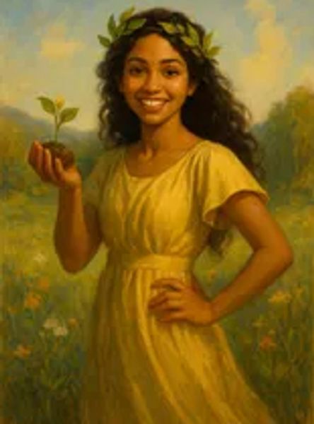 One sunny morning, Auxo noticed a young child named Mia, sitting by the edge of a meadow, looking sad. Mia was holding a small, wilted plant in her hands, her eyes filled with tears. Auxo, with her shimmering gown made of sunlight and morning dew, approached Mia with a warm smile.